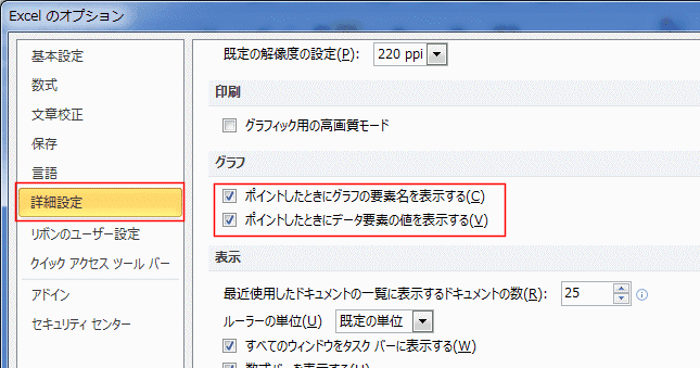 - [基本設定]を選択して、グラフで「ポイントしたときにグラフ要素名を表示する」「ポイントしたときにデータ要素の値を表示する」にチェックを入れます。