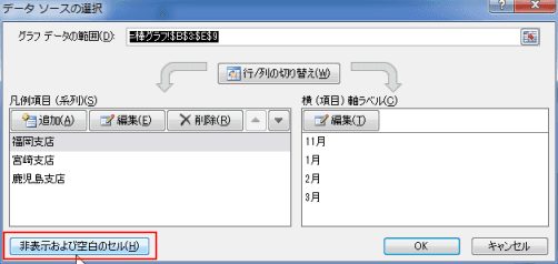 - データソースの選択 ダイアログの[非表示および空白セル]ボタンをクリックします。
