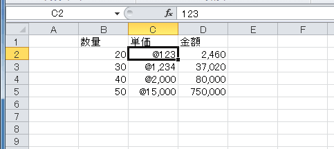 なお、入力は数値だけを入力します。 C2セルには 123 と入力しています。