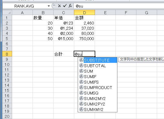- 下図のように @su と入力すると 関数のポップアップ画面が表示されます。