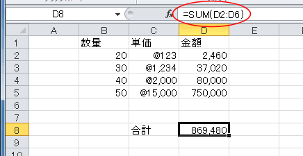 - [Enter]キーを押して、数式の入力を確定すると・・・、Excelが =SUM(D2:D6) と書き換えてくれます。