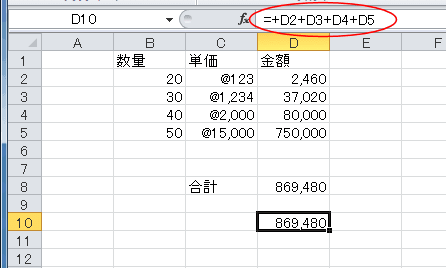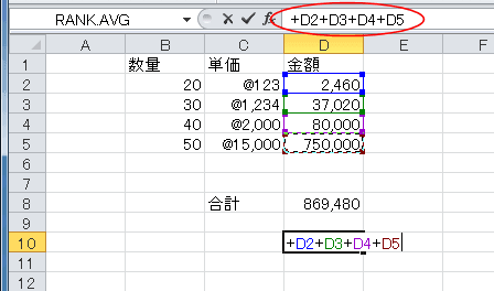 =+D2+D3+D4+D5 となっていますが、計算結果には影響がありません。