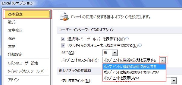 [基本設定]の「ポップヒントのスタイル」で設定します。