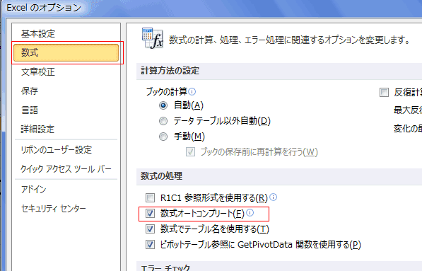 チェックが入っていると数式のヒント(数式オートコンプリート)が表示されます。