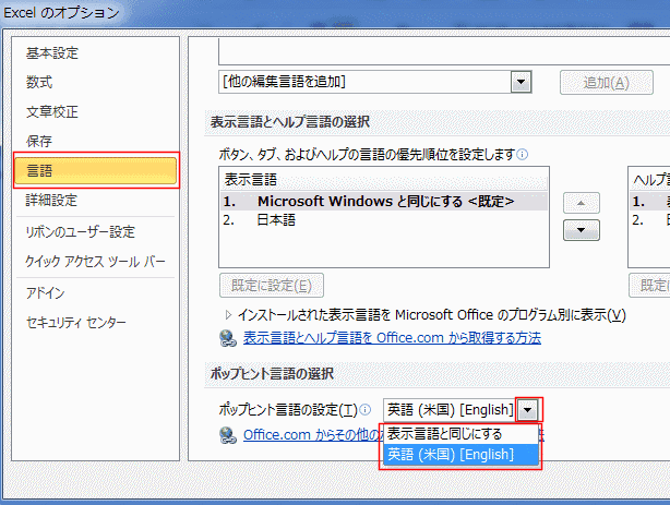 - ちなみに、Excel2013では下図のように英語表示になっています。
