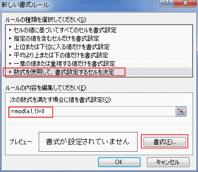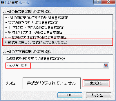 ルールに「=MOD(A1,1)=0」と入力して、[書式]ボタンをクリックします。