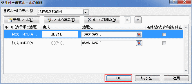 - [ホーム]タブの[条件付き書式]→[ルールの管理]を実行します。