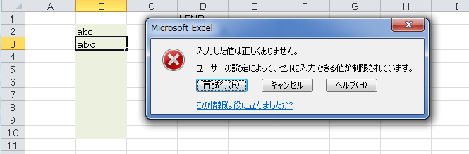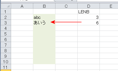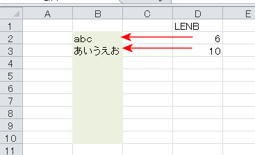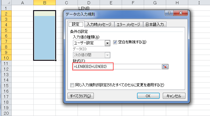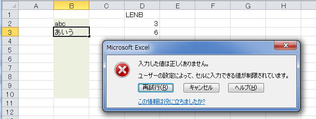 下図のように全角文字が入力できてしまいました。 右の数値はLENB関数で文字列のバイト数を求めています。