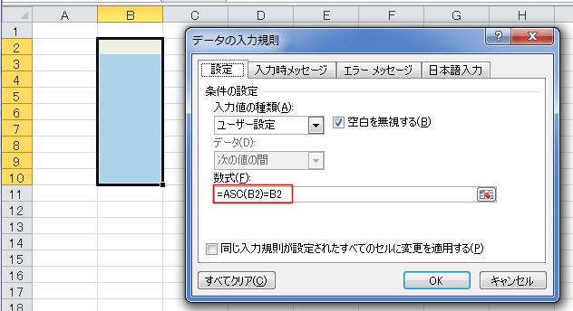 ということで、入力規則をユーザー設定で数式を =ASC(B2)=B2 としました。