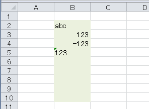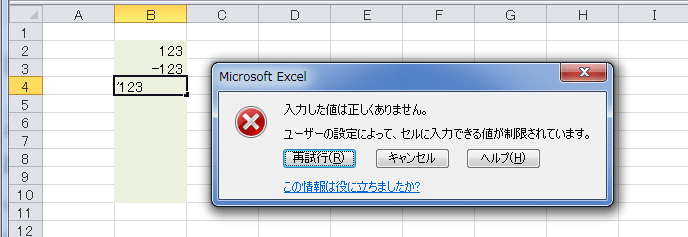 - 数値の123や-123は入力できましたが、'123 (頭にアポストロフィを付けて文字列として入力するとエラーになりました。