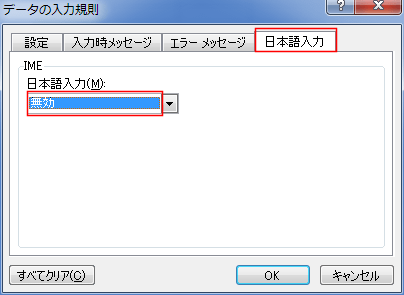 - 半角で入力を制限するには、「日本語入力」タブで「日本語入力」を「無効」に設定します。