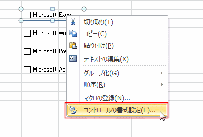 - チェックボックスを右クリックして、[コントロールの書式設定]を実行します。