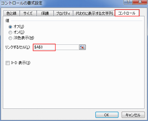 - コントロール タブのリンクするセルに「$A$3」としました。