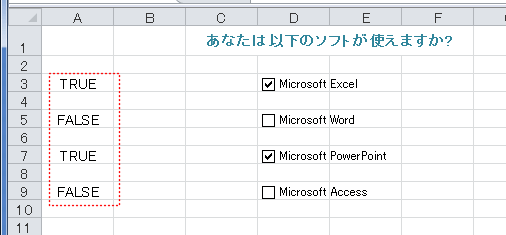 すると、チェックがオンになっているチェックボックスのリンク先のセルには「TRUE」と表示され、オフのリンク先セルには「FALSE」と表示されました。