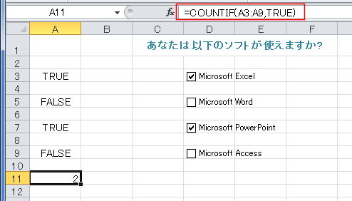 - A11セルに「=COUNTIF(A3:A9,TRUE)」と入力すると「2」となり、カウントされました。