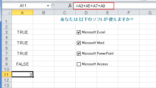 ワークシートではTRUE=1、FALSE=0で足し算ができます。