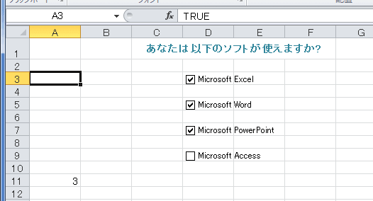 - チェックがオンのチェックボックスをカウントするには、リンク先のセルのTRUEの数を数えればよいことが分かります。