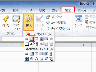 - [開発]タブの[コントロール]グループにある[挿入]を選択して、フォームコントロールの[コンボボックス]を選択し、シート内へ配置します。