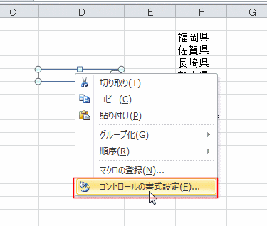 - 設置したコンボボックスを右クリックし、[コントロールの書式設定]を選択します。