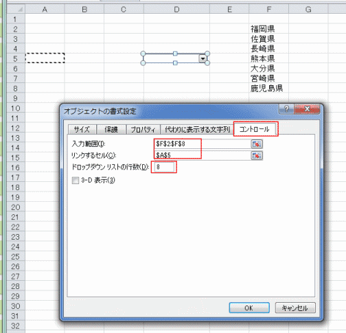 - [コントロール]タブで入力範囲を「F2:F8」、リンクするセルを「A5」としました。