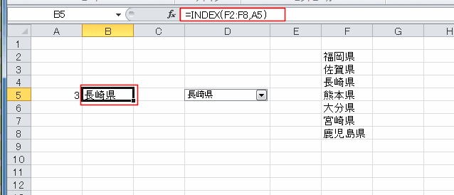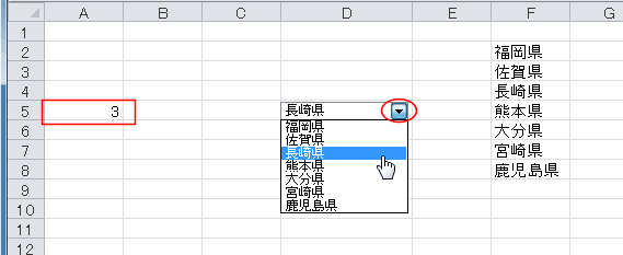 - 下図では「長崎県」を選択しているので、A5セルには「3」と表示されました。