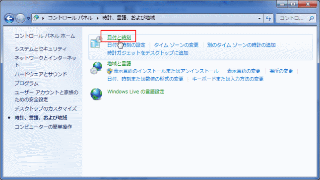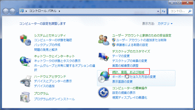- 「時計、言語、および地域」をクリックします。