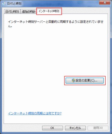 「インターネット時刻サーバーと自動的に同期するように設定されていません」と表示される場合は、[設定の変更]を実行します。