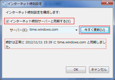 - 「インターネット時刻サーバーと同期する」にチェックを入れます。