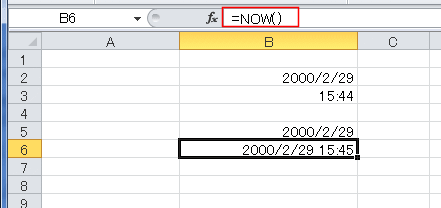- =NOW() とすると、今日の日付と時刻が合わせて表示じされます。ただし、再計算の度に時刻が変更されます。