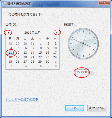 - カレンダーと時計が表示されますので、現在の日付と時刻に合わせます。