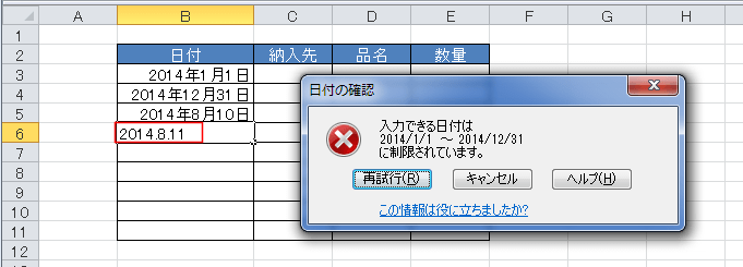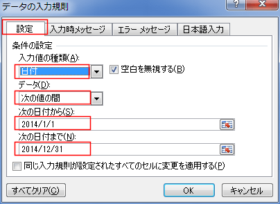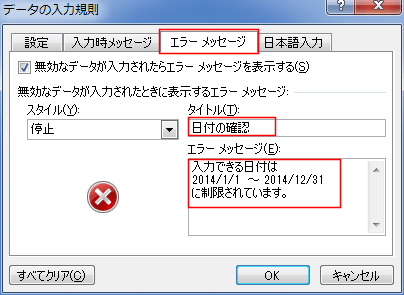 エラーメッセージには「入力できる日付は 2014/1/1 〜 2014/12/31 に制限されています。」と入力しました。