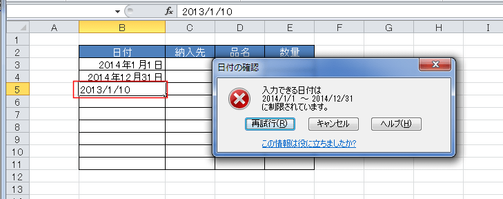 - 日付のセルに「2013/1/10」と不適切な値を入力しようとすると、エラーメッセージが表示されます。