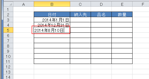 - 「2014年8月10日」と入力した場合は、Excelが日付と認識してくれるのでエラーはなく、入力ができます。