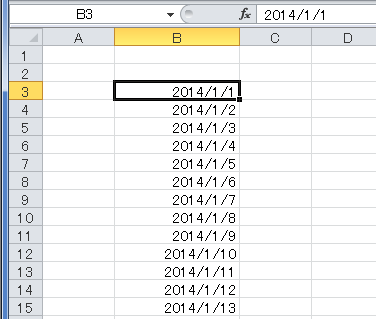 - Sheet2のB3以降に 2014/1/1〜2014/12/31 までの日付が入力できました。