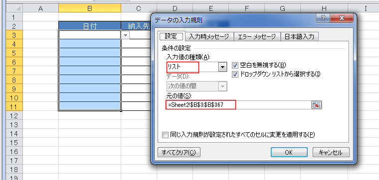 - ここでは、リストから入力する例を書いていますが、使い方によってはリスト以外の日付を入力できないようにすることができます。