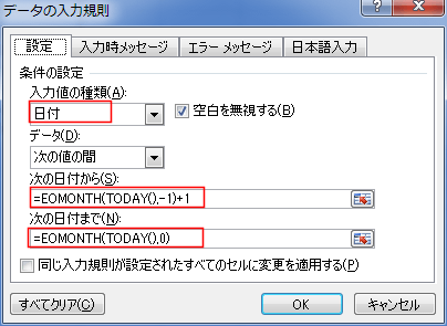- 「次の日付まで」では =EOMONTH(TODAY(),0) として、今月の末日を指定します。