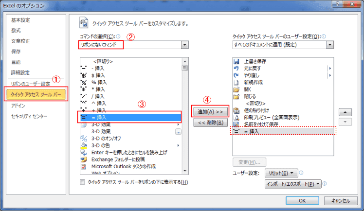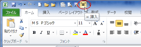 - クイックアクセスツールバーに「"=" =挿入」が表示されました。
