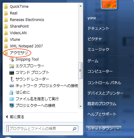 - スタートボタンをクリックして、[アクセサリ]を開きます。