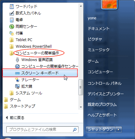 - さらに、「コンピューターの簡単操作」を開いて、[スクリーンキーボード]をクリックします。