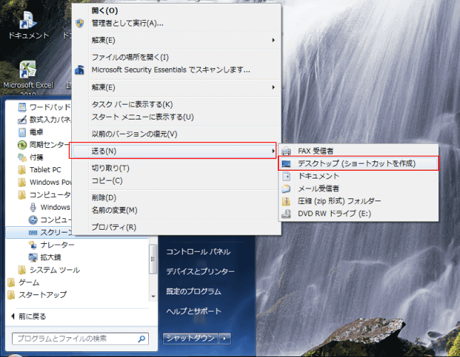[スクリーンキーボード]を右クリックして、[送る]→[デスクトップ(ショートカットを作成)]を実行します。