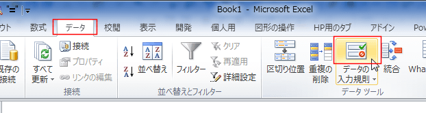 - 「データ」タブの[データの入力規則]を実行します。