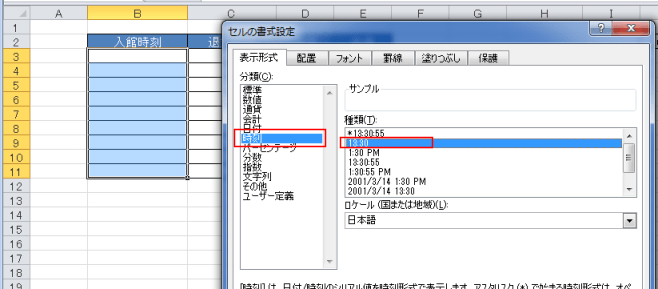 セルの書式設定で、表示形式を時刻の 13:30 としました。