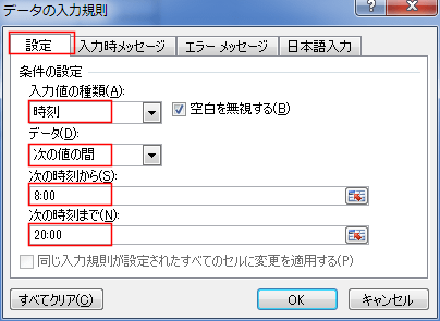ここでは、8:00 〜 20:00 の時刻だけを入力できるように入力規則で制限したいと思います。