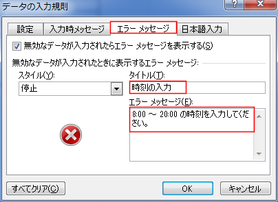 エラーメッセージに「8:00 〜 20:00 の時刻を入力してください。」と入力しました。