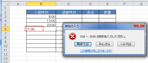 「7:00」と入力すると、範囲外なので、設定したエラーが表示されました。