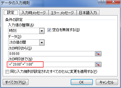 - ところが、="23:00"+"1:00" と計算式を入力すると、設定することができます。