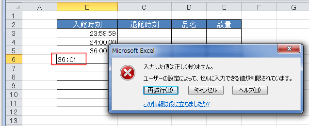 - 「24:00」は入力できましたが、「24:00:01」と入力するとエラーになりますので、24:00までに制限されていることが分かります。