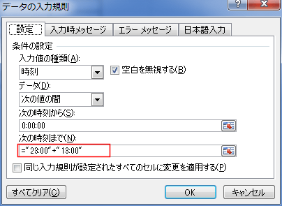 - なので、「36:00」といったような設定をしたいときは、="23:00"+"13:00" とすることができます。