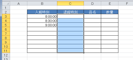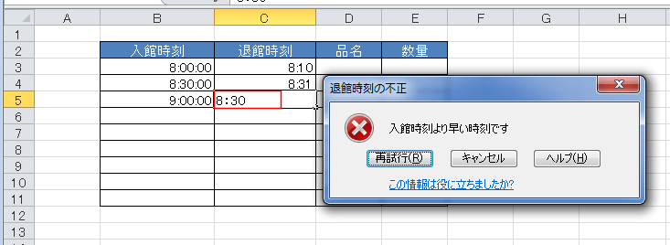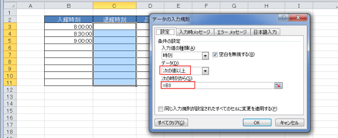 - 下図の退館時刻の入力は左隣のセルの時刻より後でないと入力できないようにしたいと思います。