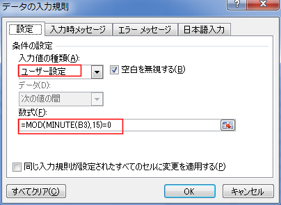 - 入力した時刻の分をMINUTE関数で取り出して、15で割った余りをMOD関数で求めます。余りが0である時に入力が可能にしています。